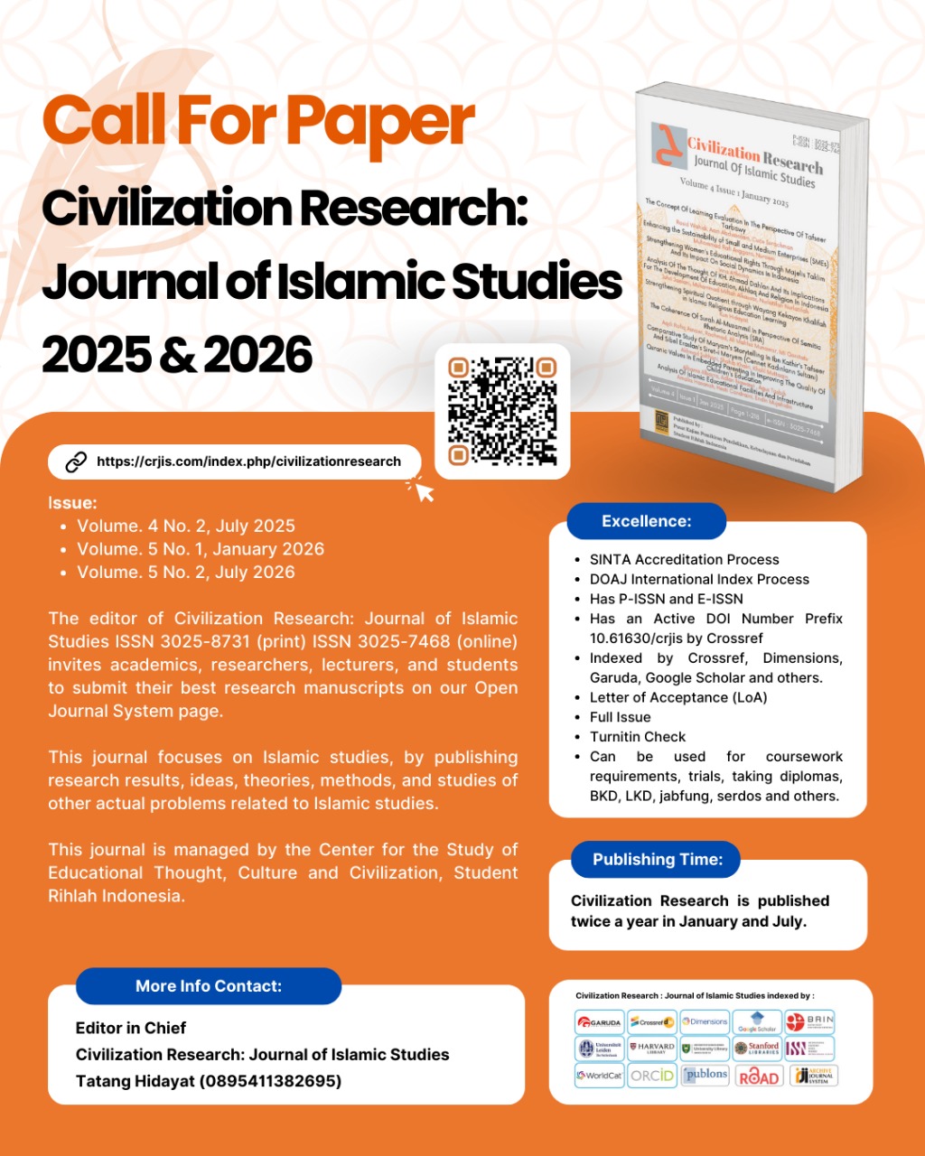 Civilization Research: Journal of Islamic Studies (P-ISSN 3025-8731 E-ISSN 3025-7468) is a blind peer-reviewed journal studying Islamic civilization published by Student Rihlah Indonesia. CR is motivated by a lack of Muslim-spiritual values to understand the contribution of Islam to the development of many scientific disciplines for modern civilization. Hence, CR attempts to integrate such kind science disciplines into Islam as a way of life in modern civilization. For this purpose, CR is designed as a unique peer-reviewed open-access online scientific journal that provides an interdisciplinary, national, international, and interfaith forum for scientists from any discipline area. It encourages reflective thinking and progressive working on modern Islamic civilization. CR welcomes theoretical or empirical studies about the application of Islamic and Sharia concepts in many disciplines including social science, economics, politics, natural science and technology, and law.